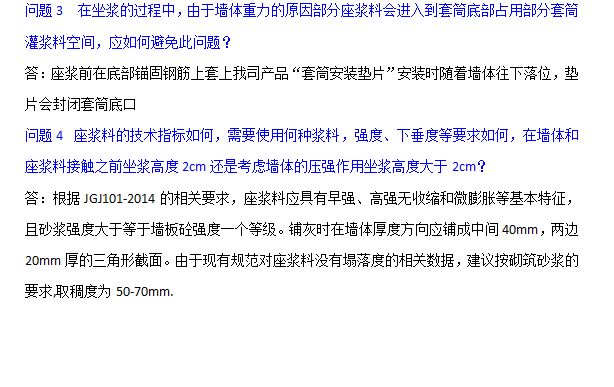 問題4 座漿料的技術(shù)指標(biāo)如何,需要使用何種漿料,強(qiáng)度、下垂度等要求如何,在墻體和座漿料接觸之前坐漿高度2cm還是考慮墻體的壓強(qiáng)作用坐漿高度大于2cm?