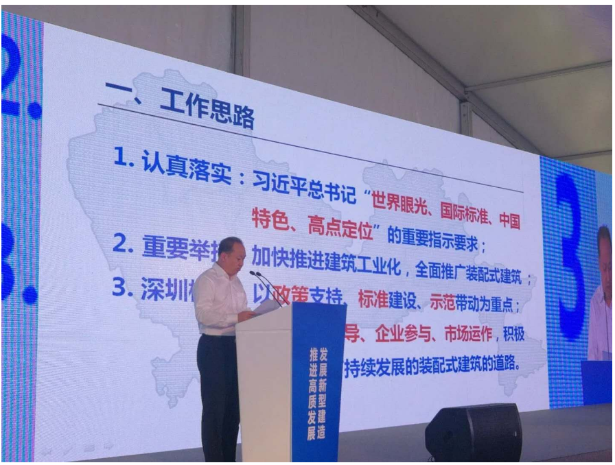 他首先高度贊揚深圳是一個充滿朝氣、年輕有活力的城市。在裝配式建筑領域,深圳先行先試、率先探索,邁出了扎實有效的一步。他要求,以深圳為代表的先行城市,要繼續發揮先進引領作用,做好“擴面、增量、創優、推廣”工作,當好全省裝配式建筑發展的排頭兵。