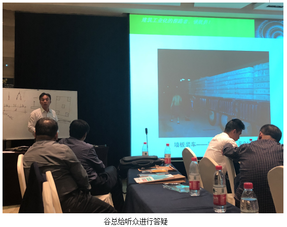 會上,現代營造總經理谷明旺為大家分享了建筑工業化系統解決方案的成功案例及技術要點。在交流環節上,與會人員提出了許多關于裝配式建筑行業中設計、生產、施工等各個方面的問題,谷總結合行業的發展和與會人員的實際情況,進行了一一解答。與會專家們在與谷總交流完后,都對我司建筑工業化系統解決方案表示高度認同。