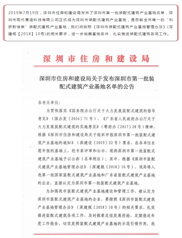 喜訊!現代營造獲批成為深圳市第一批裝配式建筑產業基地